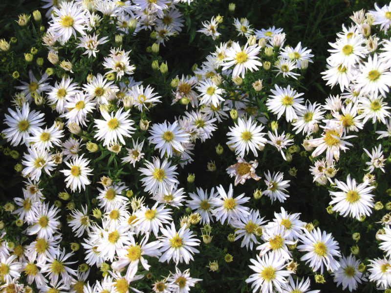 Рассада астры гибридной Шнеекиссен (Schneekissen) образует широкий полушаровидный кустарник, который наибольшей декоративности достигает в период цветения. Цветки с белыми лепестками-язычками и желтоватой серединкой прекрасно практически перекрывают темно-зеленую листву.