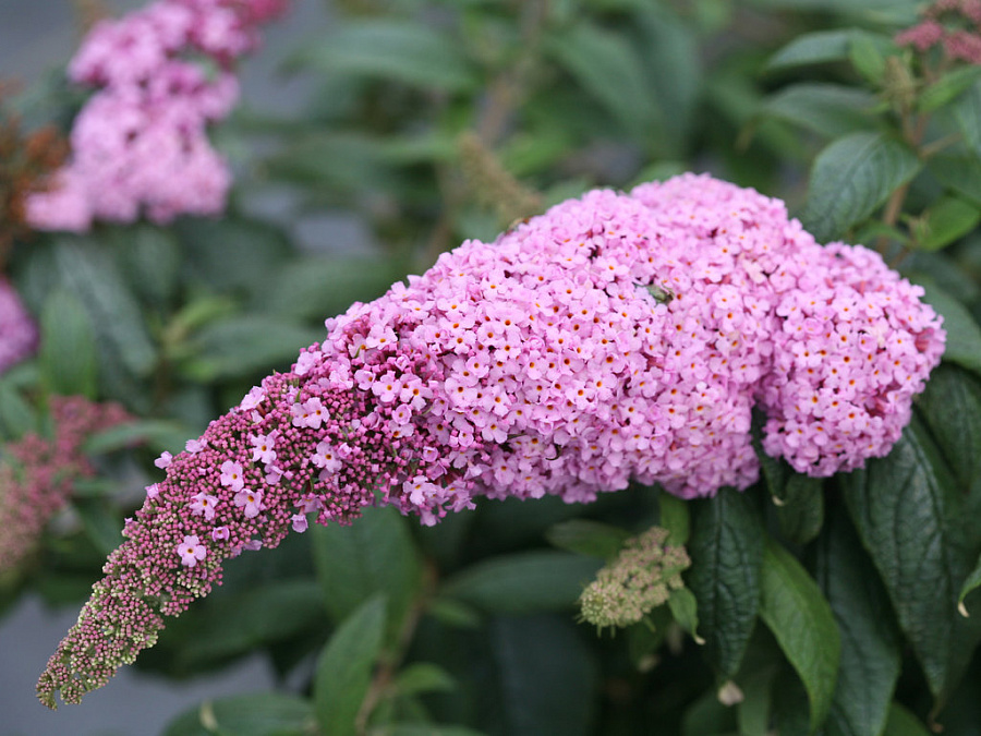 Саженцы буддлеи Давида Пинк Делайт (Pink Delight) удачно подменят большинство растений, цветущих весной или в начале лета. Время цветения этого эффектного кустарника — с июля, иногда до заморозков. Высота и диаметр куста 2 м, форма — раскидистая, рост быстрый. Розовые, с серебристым отливом, цветы собраны в соцветия длиной 30-50 см. Рекомендуемые условия:
