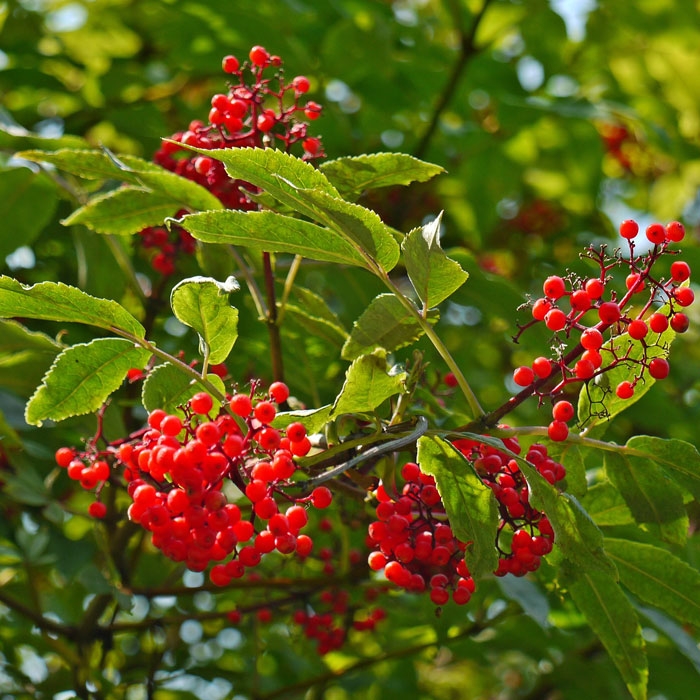 Саженцы Бузины красной Голденлокс на штамбе (Sambucus racemosa) – декоративный листопадный кустарник. Его высота достигает 200 сантиметров. Крона шаровидной формы, густая, диаметром около 150 сантиметров. Сорт бузины Голденлокс популярен на фоне своих шаровидных ярко-красных плодов. Листья желтые продолговато-яйцевидной формы, рассеченные. Цветет бузина в июне-июле белыми цветками, собранными в метелки длиной до 6 сантиметров. Кустарник теневынослив, но может прорастать и на солнечной местности. Не терпит сквозных холодных ветров. При недостаточной влаге стает восприимчив к болезням. Зимостоек.