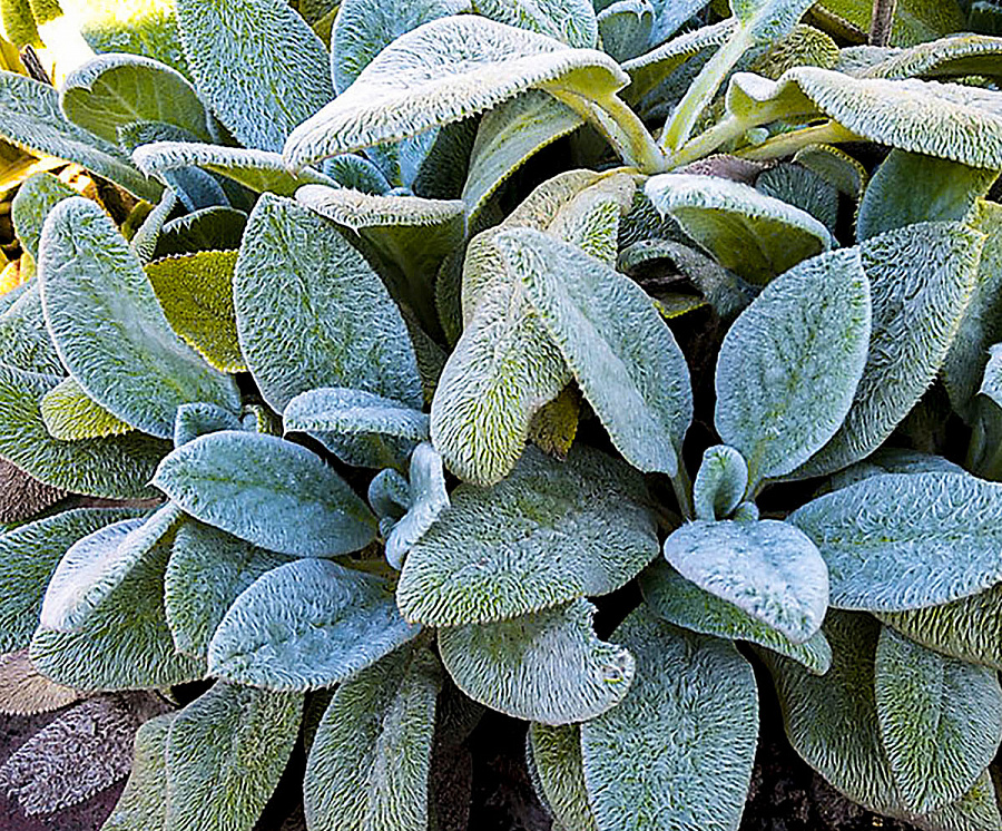 Рассада чистеца шерстистого – почвопокровное растение, в высоту не более 40 сантиметров, образует мягкий живой коврик серебристо-синего цвета. В народе чистец шерстистый также называют овечьим ушком из-за его овальных листьев, покрытых светлым пушком. На ощупь листья очень нежные, имеют вельветовую текстуру.