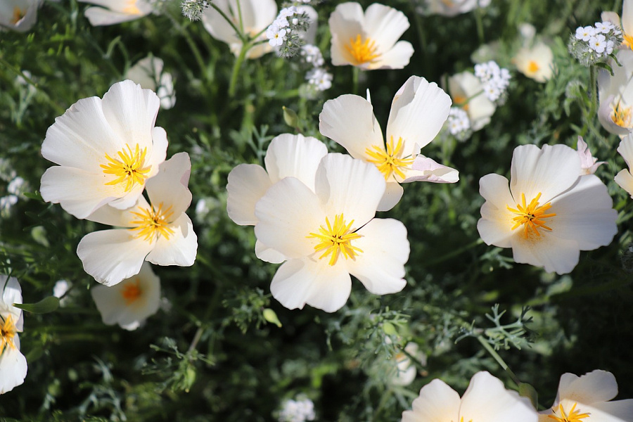 Семена эшшольции калифорнийской сорта Белый замок порадуют садоводов эффектным видом выращенного экземпляра. Компактный куст с серебристо-зелеными побегами и белыми чашевидными цветами отлично впишется в любую садовую композицию. Цветение продолжится с июня до октября.
