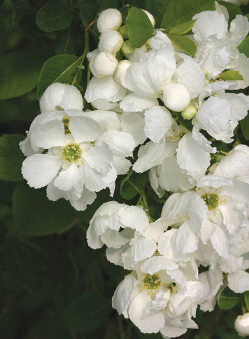 Ценится сорт экзохорды Сноу Дей Близард за свое обильное и вместе с тем ранее цветение, в апреле-мае. Его цветы крупные, белоснежно-белые, снизу до верху нанизаны на ветках. Листья сорта зеленый эллиптической формы.