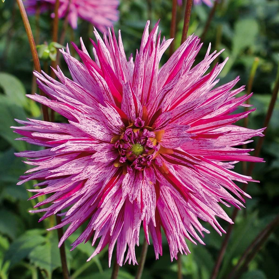 Саженцы и рассада Георгины бахромчатой Страйпт Амбишн (Dahlia cultorum) станут отличным выбором как для украшения цветника, так и для выращивания под срезку. Крупные, до 12 см в диаметре цветки, отличаются насыщенным сиреневым, иногда розоватым цветом. По основному фону идёт едва заметный белый штрих. Особую экзотичность придают цветам длинные узкие лепестки, рассеченные на концах.