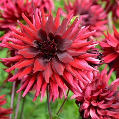 Георгин Крев Кёр – яркий представитель семейства Макси. Он полностью оправдывает сей почетный статус, из года в год выдавая многочисленные соцветия исполинских размеров. Мощный и пышный куст с сильно разветвленными полыми побегами. Практически каждый побег заканчивается махровым соцветием сочной и равномерной красной расцветки. Цветы состоят из невообразимого количества плоских и широких лепестков, заостряющихся в конце.