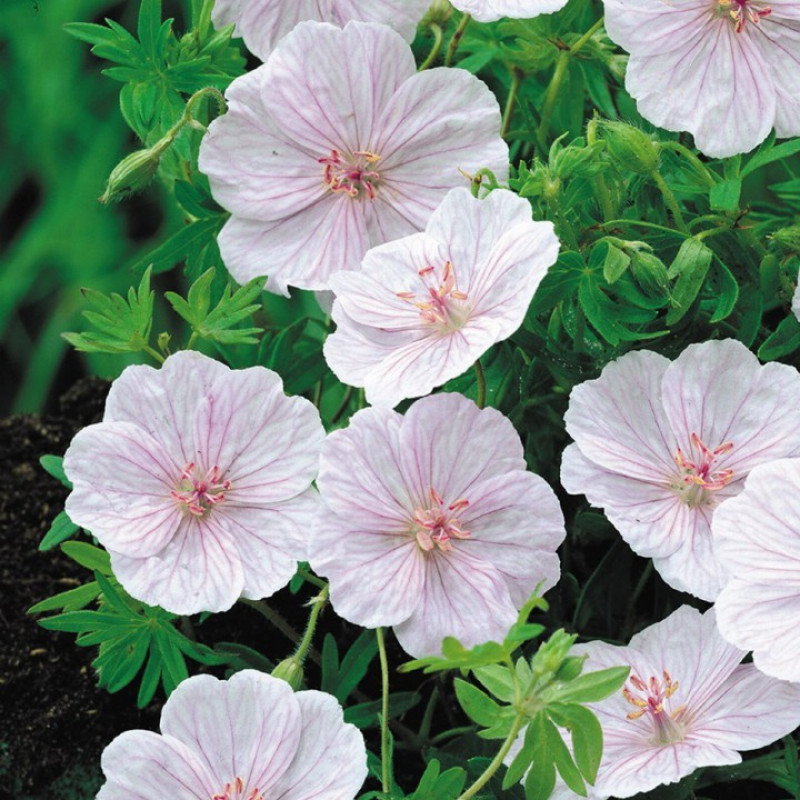 Саженцы Герани кроваво-красной Striatum (Geranium sanquineum) – травянистое многолетнее растение с хорошо развитой корневой системой. Устойчиво к морозам, благодаря чему подходит для высаживания в открытом грунте в Центральной полосе России, а также в северных и горных районах Скандинавии. Высота герани Стриатум составляет 15-20 см, а в диаметре растение достигает 30-40 см. Его ярко-зеленые многодольные листья красиво гармонируют с ежно-розвыми остроконечными цветками-чашелистиками с розовыми жилками. Многолетник неприхотлив к составу почвы и уходу. Его полив проводят по мере высыхания грунта, а единственным условием для роста является отсутствие застоя грунтовых вод.