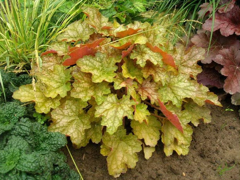 Рассада гейхеры Джинджер Але (Ginger Ale) отличается от других сортов необычной кремово-рыжей окраской, которая меняется на протяжении всего сезона. Молодые листья имеют оранжевый оттенок, который со временем темнеет, а на поверхности проступают темные прожилки.