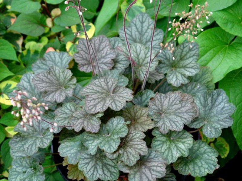 Рассада гейхеры Пино Нуар (Pinot Noir) украсит ваш сад невероятной темно-пурпурной листвой с легким серебристым налетом. Во второй половине лета и без того эффектный вид будет дополнен привлекательными бело-кремовыми цветочками. Этот сорт отлично подходит для формирования клумб, украшения мест отдыха и декорирования бордюров.