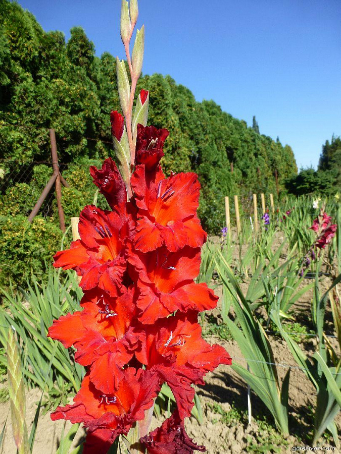 Луковицы гладиолуса гибридного Азурро (Azurro), новинки селекции, сегодня доступны всем садоводам. Растение отличается высокорослостью, до 110 сантиметров, прочным прямостоячим стеблем и тонкими длинными ярко-зелеными листьями. Цветы по 8-10 штук собраны в соцветие «кисть», очень крупные, до 20 сантиметров в диаметре. Лепестки окрашены в насыщенно-красные тона, с плавным переходом от яркого до темного. Слегка волнистые края придают цветку изысканности и шарма. Сорт Azurro – украшение коллекции любителей гладиолусов. Он прекрасно смотрится в букетах и композициях, символизирующих любовь и страсть.
