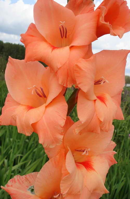 Гладиолус крупноцветковый "Питер Пирс" - это великолепное растение, которое поразит вас своей красотой и изысканностью. Его стебель прочный и прямой, достигает внушительной высоты, а цветки лососевого оттенка с красным пятном привлекают взгляды и создают неповторимую атмосферу в вашем саду.