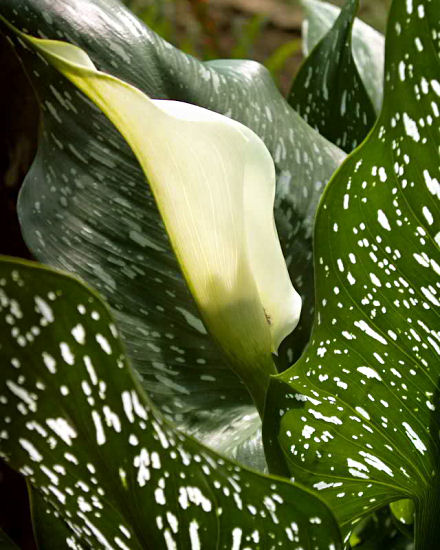 Калла белопятнистая - это изысканное растение с темно-зелеными листьями и белыми цветками, которые расцветают в марте. Ее высота достигает 50-60 см, что делает ее идеальным выбором для миксбордеров. Это растение предпочитает солнечные места и дренированные богатые почвы.