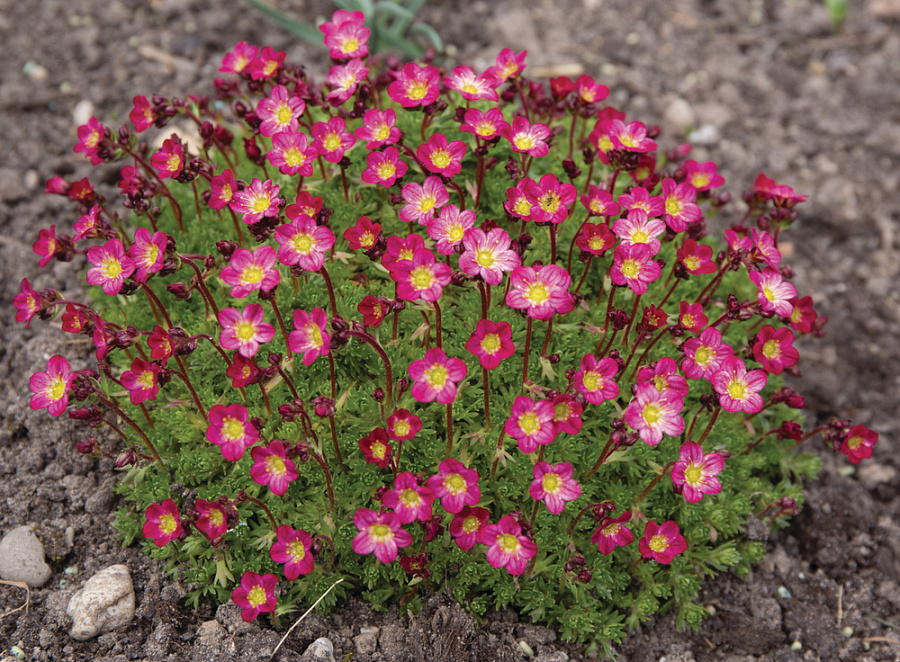 Рассада камнеломки Карпет Пепл Роуб (Carpet Purple Robe) вырастает около 15-20 см в высоту и имеет плотный кустик. Обильное цветение начинается в мае-июне. Цветочки небольшие темно-розового цвета, напоминают бабочек, присевших на растение. Листва маленького размера собрана в прикорневой розетке. Достоинства камнеломки Карпет Пепл Роуб: