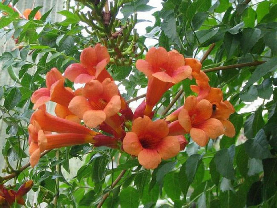 Кампсис укореняющийся урсинов - это великолепное растение с оранжевыми цветками, которое поразит вас своей красотой и изяществом. Его ствол прочный и устойчивый, а размеры растения позволяют ему стать настоящим украшением вашего сада или огорода. Листья кампсиса имеют необычную форму, что делает его еще более привлекательным.