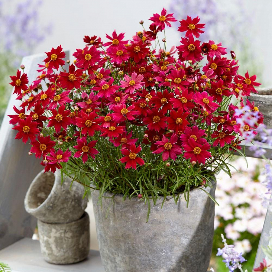 Рассада кореопсиса розового Bloomsation dragon позволит украсить сад эффектным многолетником, не требующим сложного ухода. Это растение представляет собой куст высотой до 40 сантиметров, на котором летом появляются красивые цветы с желтыми серединками и красными лепестками. Цветение продолжается до конца августа.