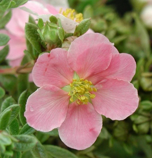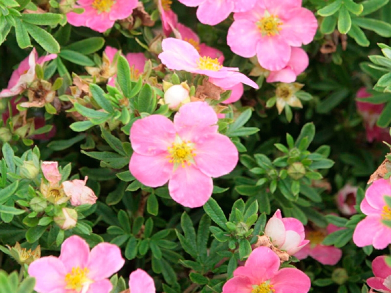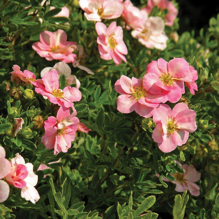 • у крупномера, посаженного в солнечном месте, крона густая и ажурная. Цветет этот сорт лапчатки с начала июня до середины октября. Ярко-зеленые листочки гармонично сочетаются с розовыми цветами. Сделать нежно-розовые цветы ярче и насыщенней поможет подкисление почвы и небольшая подкормка. Растению не страшны садовые вредители и сильные холода.