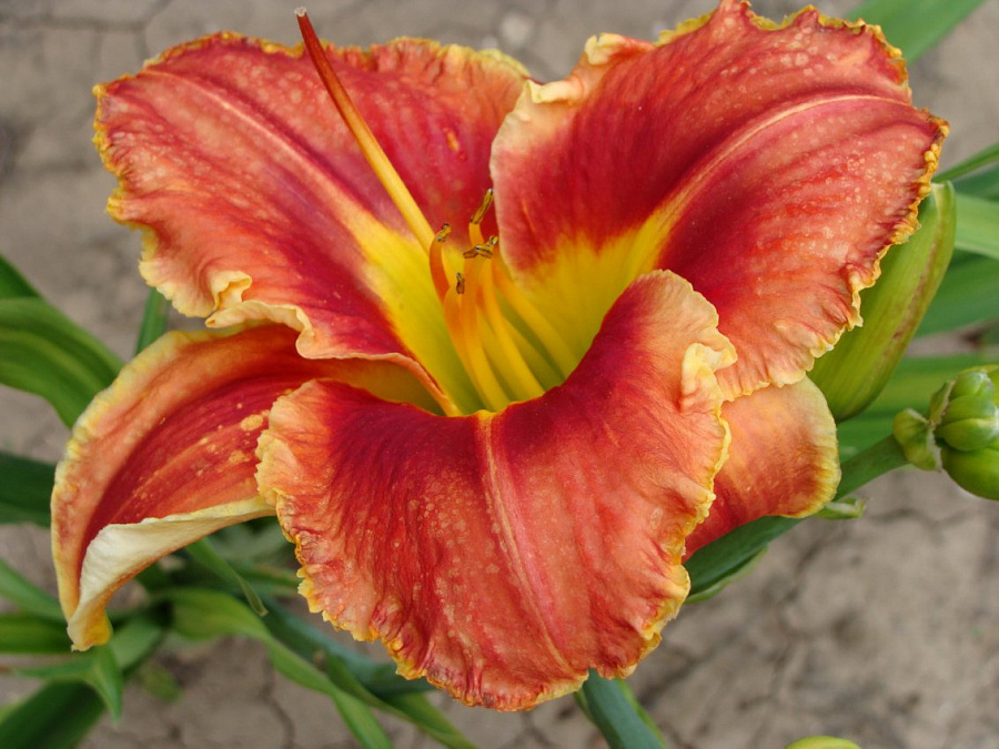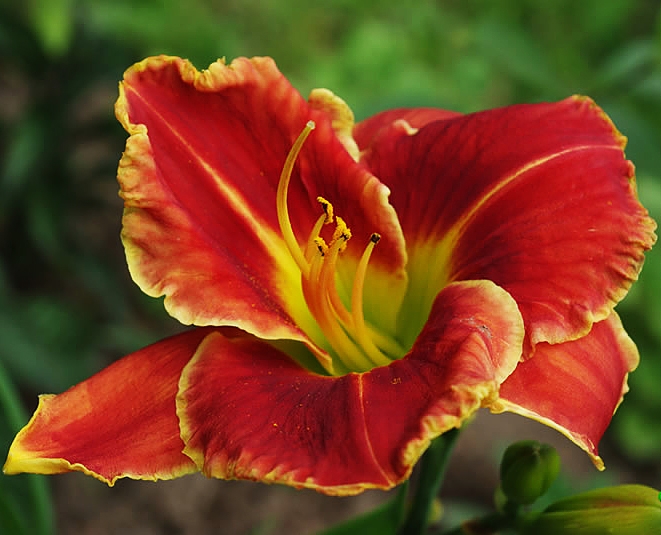 • Окраска цветка : Ярко-красная с зелёным горлом и тонкой гофрированной золотистой каймой
