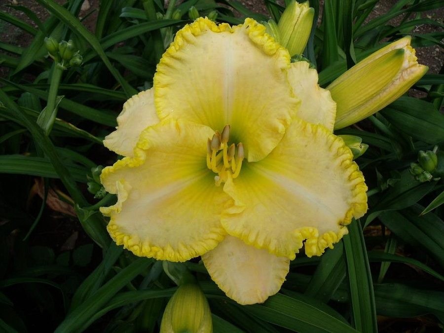 Рассада лилейника Фест Найт (First Knight) придется по душе тем цветоводам, которые ценят простоту и элегантность. Растение цветет крупными бутонами по несколько штук на одном стебле, создавая своеобразный букет. Цвет лепестков имеет нежно-желтый оттенок, а по краю идет обрамление гофрированной золотистой каймой. Многие оценят достоинства этого превосходного сорта: