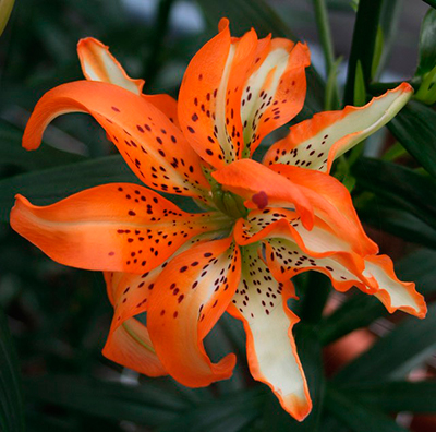 Окраска цветка : цветы ярко-оранжевые с темными вкраплениями, со временем меняются на белые с салатовым центром, крап остается, цветение длительное