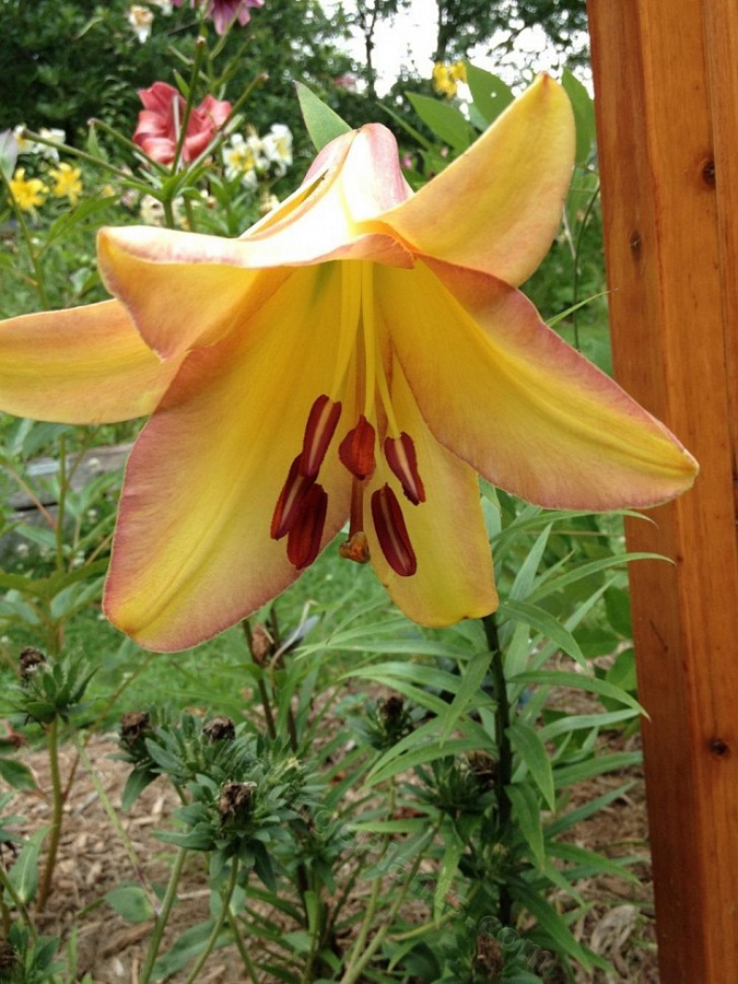 • Окраска цветка : желтый с палево-розовой каймой и темными пыльниками
