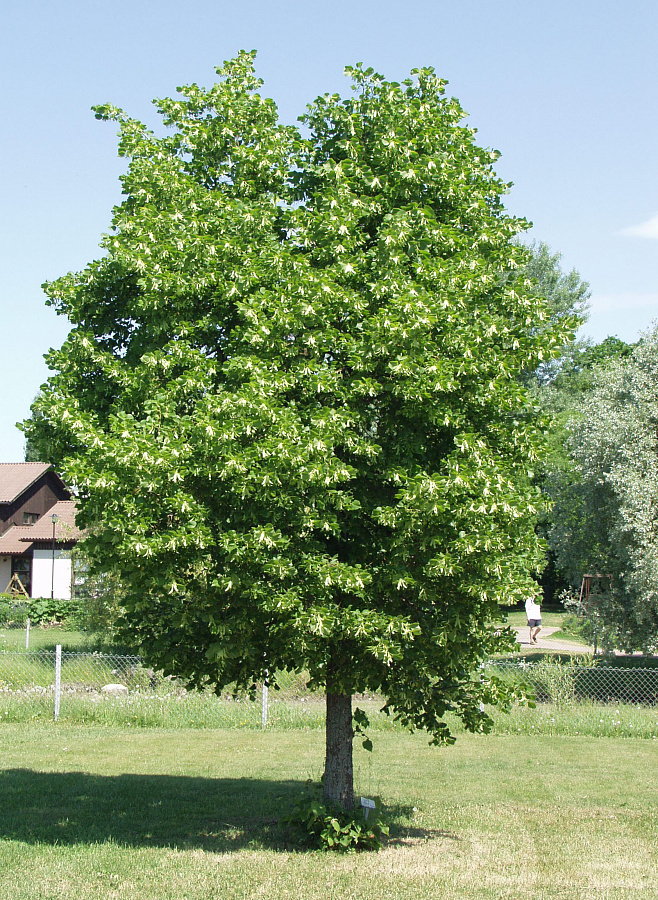 Саженцы липы крупнолистной - проверенный годами вид листопадных деревьев, отличается шикарной густой кроной, ароматным цветением и стойкостью к погодным условиям. Взрослые крупномеры очень высокие – до 30-40 м. Главная прелесть растения – в обилии душистых цветов, источнике целебных свойств. Цветение начинается в первой половине лета, желтыми соцветиями, из которых развиваются плоды – ребристые орешки. Листья заостренные, сердцевидные. Крона у липы крупноцветной по форме похожа на округлую пирамиду.