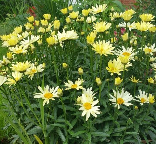 • хорошая зимостойкость. Лепестки у цветка сливочно-желтые, могут светлеть до молочно-белого, а серединка золотая. Получить рассаду можно, высевая собранные семена в марте. Нивяник наибольший Броадвей Лайтс используется для букетных композиций и всех видов цветочный декораций, довольно долго стоит в срезке.