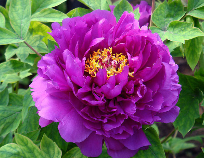 Саженцы пиона древовидного Фиолетовый лотос (Paeonia Suffruticosa) относятся к декоративным красивоцветущим многолетникам. Отлично смотрятся в групповых посадках с другими сортами пионов. Расти предпочитают на дренированных почвах и солнечных участках. Нормально переносят небольшую полутень. Кустарник декоративно смотрится даже после цветения из-за пышной листвы. Высота кустов – до 1,2 метров, стебли раскидистые. Цветки крупные, полумахровые, темно-лилового оттенка. Аромат от соцветий распространяется по всему саду. Бутоны распускаются в мае.