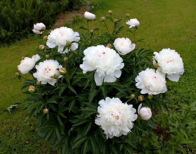 Саженцы Пиона Молочноцветкового Фестива Максима (Festiva Maxima Paeonia lactiflora) – это цветущие облака, которые украшают сады и палисадники на протяжении почти всего июня. Первые бутоны появляются уже в конце мая и на протяжении 2-3 недель можно наслаждаться великолепием этих пышных и таких неприхотливых растений. Бутоны раскрываются практически одновременно, на каждом кусте может появиться 20-30 цветов, каждый из которых в диаметре достигает 17-20 сантиметров. Прочный стебель с легкостью удерживает такую массу, лишь слегка пригибаясь к земле. Растение не требует подвязки и установки дополнительных подпорок.