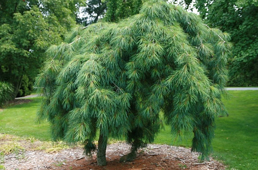Саженцы сосны веймутовой Pendula — обладатели плакучей кроны, которую необходимо направлять вверх с помощью опоры. Ниспадающие ветви, усеянные мягкими зелёными иголками и длинными фиолетовыми шишками, выгодно подчёркивают изящность и стройность дерева. Рост сосны идёт довольно быстро (30-40 сантиметров в год) и останавливается на отметке в 4 метра. Отличительные черты: