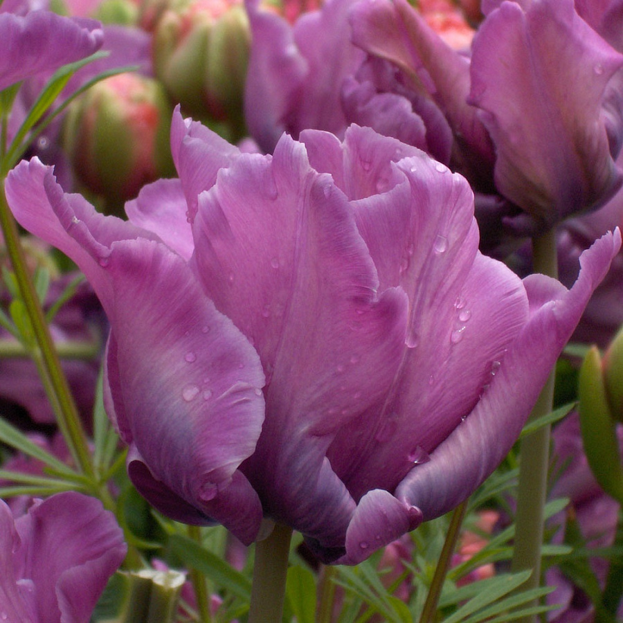 Окраска цветка : экзотический попугайный тюльпан, светло-сиреневого оттенка с голубоватым отливом, фиолетовыми и бронзовыми отблесками