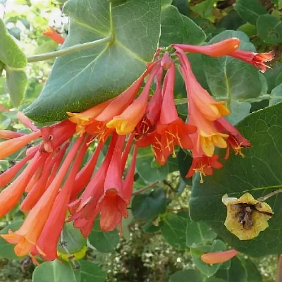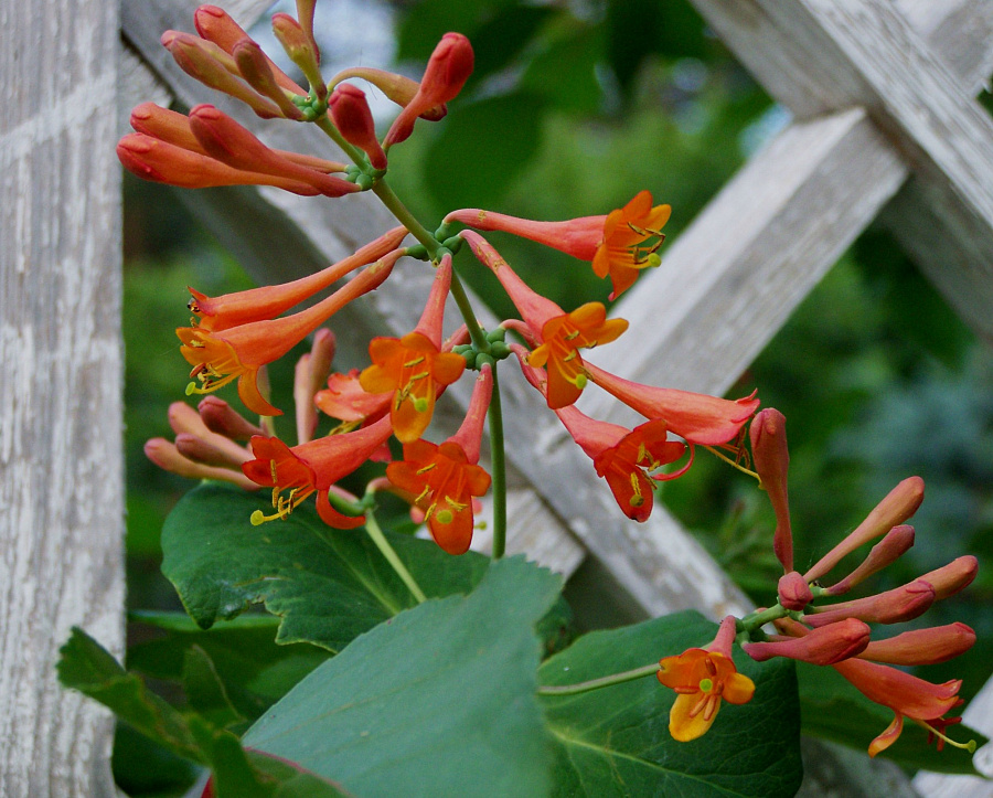 Саженцы жимолости Брауна Бланш Сэндман (Blanche Sandman) привлекают пышным и длительным цветением с июня по октябрь. Вечнозеленая кустарниковая лиана вырастает до 280 сантиметров в высоту уже к 3 году жизни. Трубчатые темно-красные с желтым центром цветки растут в кистях, по десятку в каждой. Яркий цвет бутонов подчеркивается насыщенной окраской изумрудной листвы.